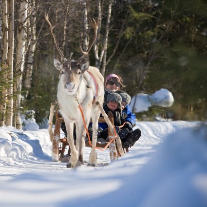 Join a 3 kilometer long reindeer sleigh ride through Levi's snowcovered forests! Sit back and relax in a traditional wooden sleigh, listen to the sounds of nature and the caravan advancing in the snow.