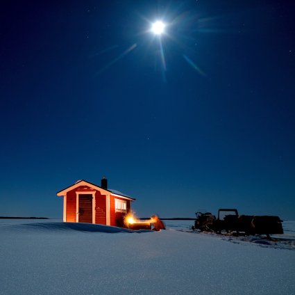 Enjoy a candle lit dinner on the frozen arctic sea just outside Luleå in Swedish Lapland. Your evening starts with a snowmobile sled transfer from your lodge to an Aurora Hideaway.
