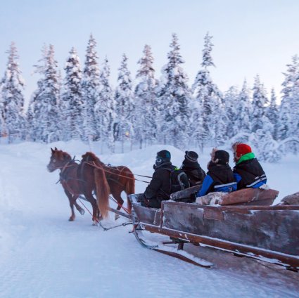 Two strong Finnish horses will pull the wooden sleigh into the peaceful forest. There will be a break in the middle of the tour and if you are lucky you can admire the magnificent Northern Lights.
