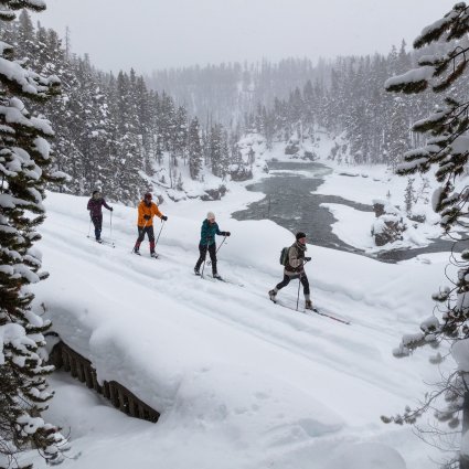 Skis, Cross country skiing instructions, short guided tour, winter gear.