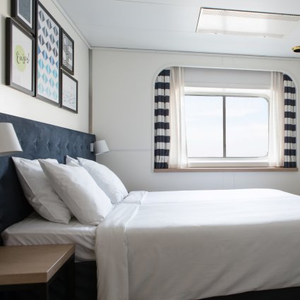 The Deluxe cabins are more elegant and spacious than the standard cabins (approximate size 14m²) and have a double bed (which is separable). The cabins have an extra bed for a child under 17 years and come with flat screen-TV, trouser press, complimentary refreshments in the minibar and a special breakfast. The Deluxe cabins face either towards the inside promenade or the sea.