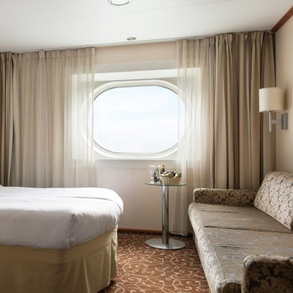 The Deluxe cabins are more elegant and spacious than the standard cabins (approximate size 14m² as opposed to 9-11m²) and have a double bed (not possible with an extra bed; one infant possible in baby cot). The cabins are located on decks 8 or 9 and come with complimentary refreshments in the minibar and a special breakfast. The Deluxe cabins have a window towards the sea.