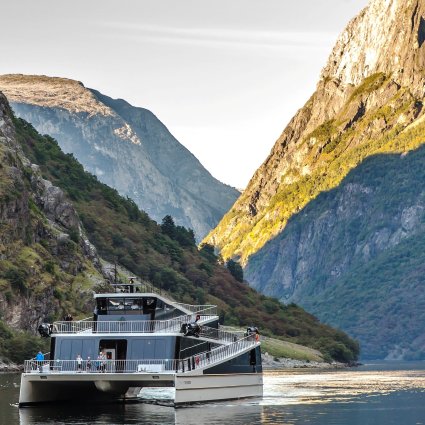 From Flåm you will board the new eco-friendly fully-electric vessel that cruises on the UNESCO listed Nærøyfjord between Flåm and Gudvangen in 2 hours. The vessel is running on battery power, keeping to a speed of less than 10 knots to allow you to enjoy the scenery to the fullest. The design of the vessel is inspired by a trail finding its way up a steep mountainside. It measures 40 meters in length and 15 meters in width. Outside the ferry, passengers will be able to climb all over the boat while the inside will feature panoramic views. The Nordic inspired interior design offers a high level of comfort.