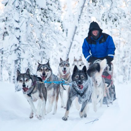 Speed silently through the Finnish taiga forest on frozen trails. Your sled is pulled by a team of friendly huskies.