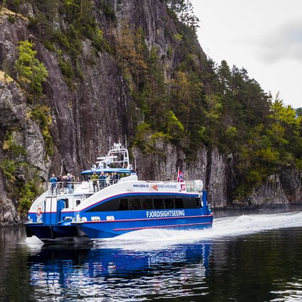 A 3,5-hour fjord cruise through western Norway fjord landscapes, an English- and Norwegian-speaking guide and a boat with different facilities.