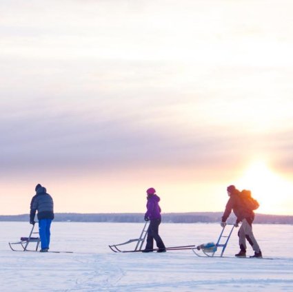 Join a kick sled tour on the ice around central Luleå in Swedish Lapland. Experience the feeling of calmly gliding over the shimmering snow and ice. Halfway through the trip you will take a break and enjoy lunch over an open fire.