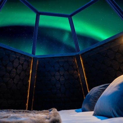 The two level luxury Lappish glass igloo Komsio Suites are equipped with a double or twin beds on the loft and a convertable sofa downstairs, an electric fireplace and a private bathroom with shower and toilet. The huts are 28m2 and here you can sleep up to 4 persons. There is a heated glass roof above the bed on the loft ensuring the best possible views of the Northern Lights.