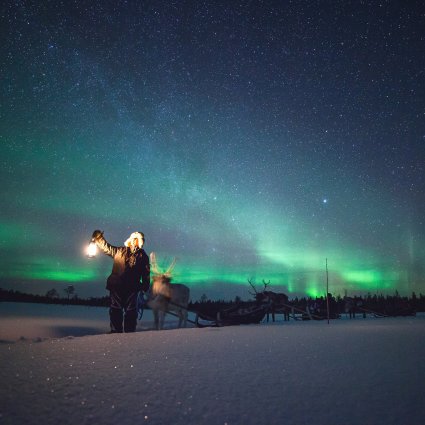 Enjoy a mystical sleigh ride through the silent and beautiful snow covered winter forest pulled by reindeers in search of the Northern Lights in Finnish Lapland.