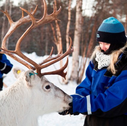 Visit a local reindeer farm and meet the adorable reindeer in the winter wonderland of Inari in Finnish Lapland.