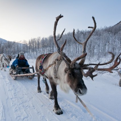 This excursion will take you to the majestic Lyngen Alps where beautiful fjords meet alpine mountains. You can just sit back, make sure you are comfortable and enjoy the view while the reindeer is pulling the sleigh.