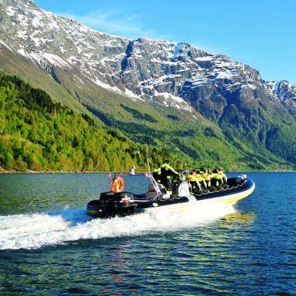 Join a 1-hour guided fjord adventure by RIB-boat on the magnificent Lustrafjord and experience some of the best scenery of the beautiful Norwegian fjords.