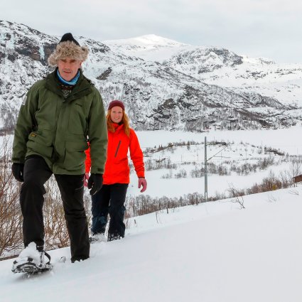 Experience the Norwegian winter on snowshoes! The tour starts in Flåm with a transfer to Aurland Mountain and Stegastein viewpoint.