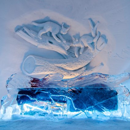 You will be picked up from your hotel in Kirkenes and transferred to the Snow Hotel, which is located in the Gabba Reindeer Park, just outside the centre of Kirkenes. Upon arrival, you will receive a welcome drink at the sculptured Snow Bar. Before going into the Snow Hotel, you can watch the happy huskies and feed the friendly reindeers.