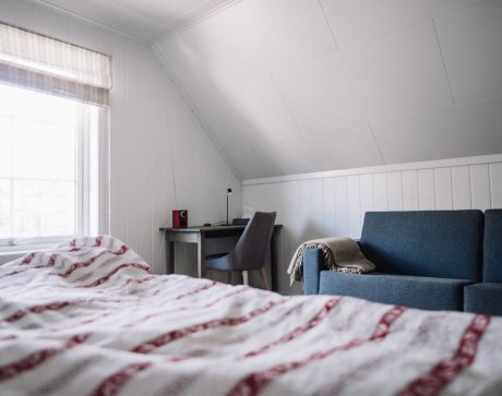 On the ground floor of Trasti & Trine´s lodge you will find a professional kitchen and a cosy dining room. On the upper floor there are two spacious bedrooms. Both have their own private bathroom, but it is located right outside the room. Please note that the shared area outside the rooms consisting of a little tea kitchen and a balcony may be shared with other guests staying in the other room. An organic and home made breakfast is included during your stay.
